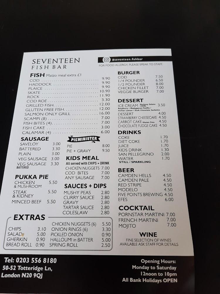 Situated at 50-52 Totteridge Ln in London, Seventeen Fish Bar is a go-to spot for fish and chips lovers. The location is conveniently placed, making it accessible whether you're popping in for a quick lunch or enjoying dinner with family. This eatery emphasizes freshness and quality, drawing in customers with its simple yet stylish interior and a commitment to cleanliness. The staff here are not just cordial; they remember regulars and create a sense of community—a rarity in the busy restaurant scene. It’s not just about the food; it’s an experience, from the welcome you receive to the delightful dishes served hot and fresh. Free street parking makes it even easier to visit, so there's no excuse not to dive into their crispy calamari or flaky fish today.